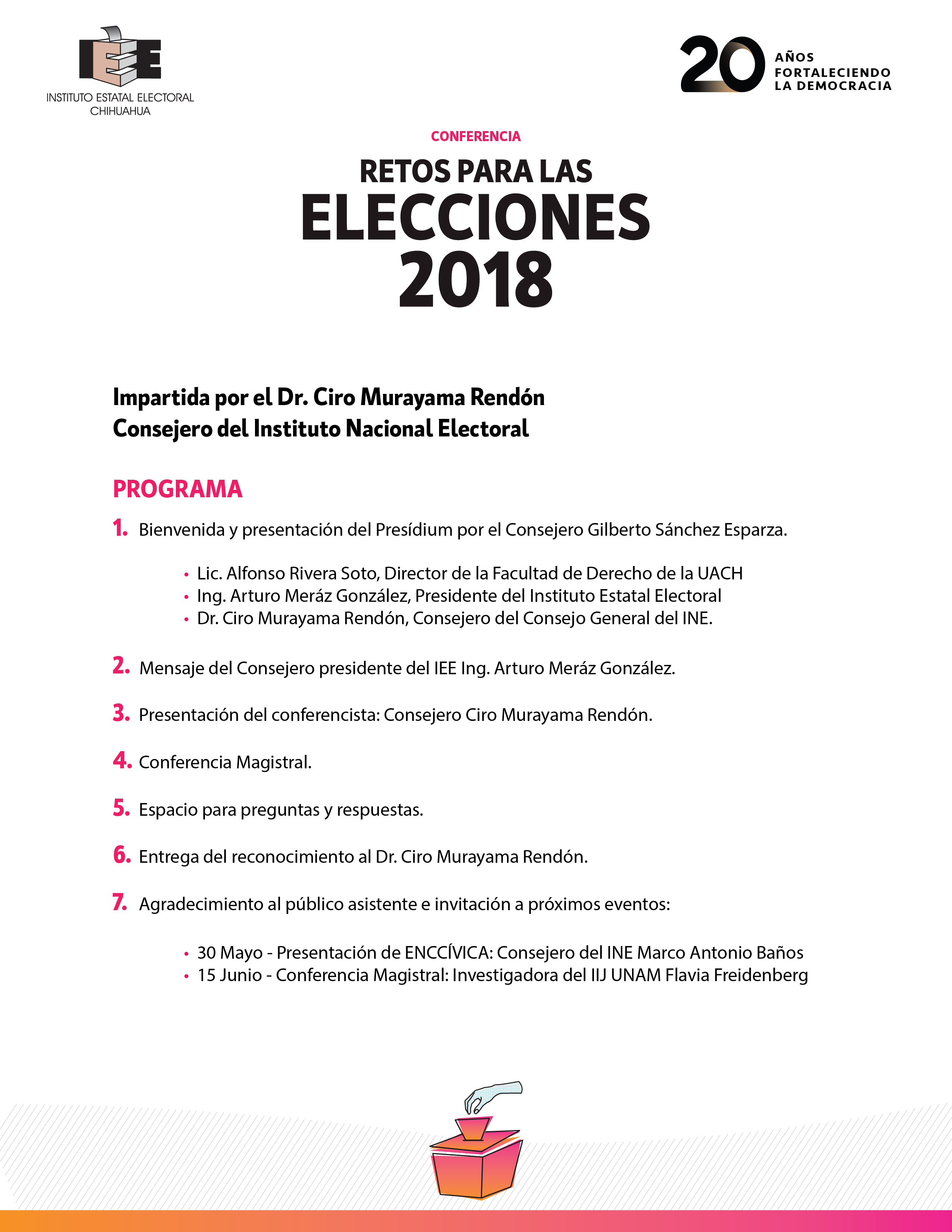 Acompáñanos en esta Conferencia impartida por el Dr. Ciro Murayama Rendón, Consejero del INE, para conocer los retos y las estrategias para este 2018, donde todos juntos en nuestro carácter de ciudadanos y ciudadanas buscaremos la participación y la amplitud de la democracia en nuestro país.