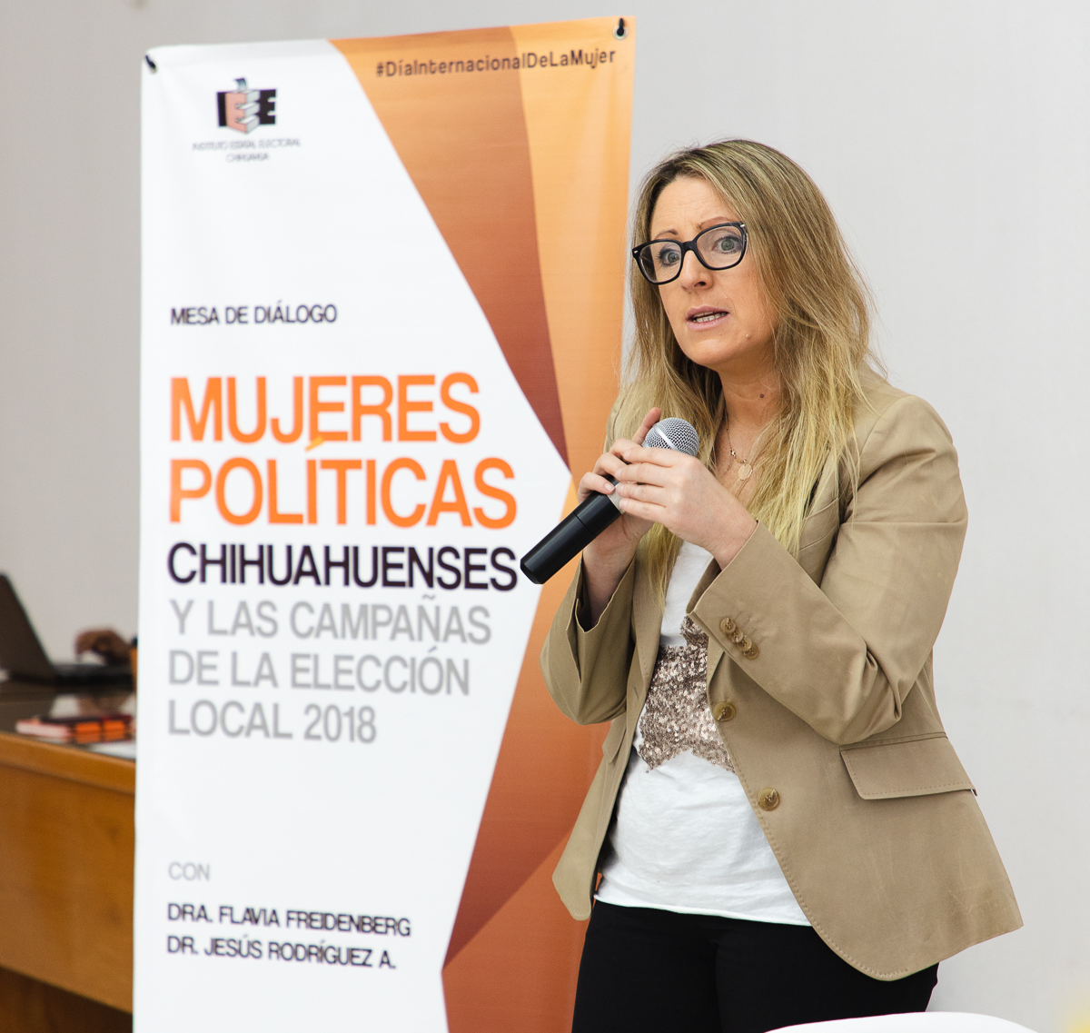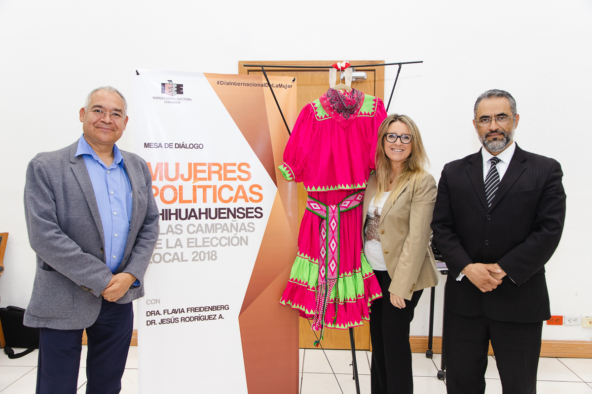 La mesa de diálogo denominada “Mujeres políticas chihuahuenses y las campañas de la elección local 2018”, se desarrolló en la sala de sesiones del Instituto Estatal Electoral de Chihuahua (IEE) y contó con la moderación de la Dra. Flavia Freidenberg y el Dr. Jesús Alberto Rodríguez Alonso, quienes se han dedicado a la academia y a la investigación del tema.