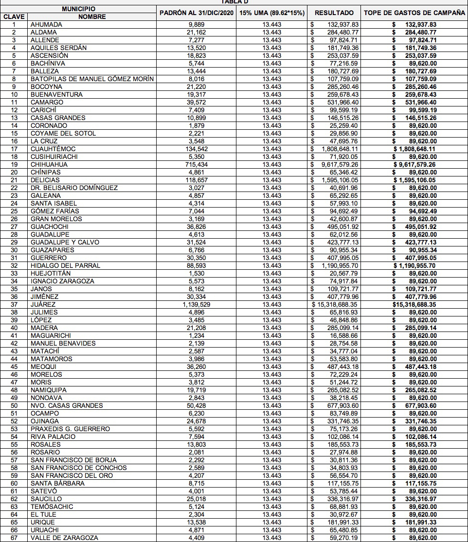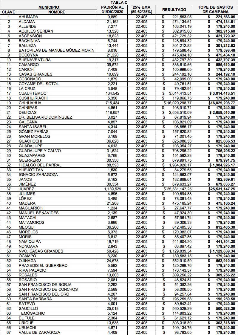 PADRÓN ELECTORAL AL 31/ DIC/2020 | VALOR DE LA UMA PARA 2021 | 25% DEL VALOR DE LA UMA | TOPE GASTOS DE CAMPAÑA PARA GUBERNATURA |