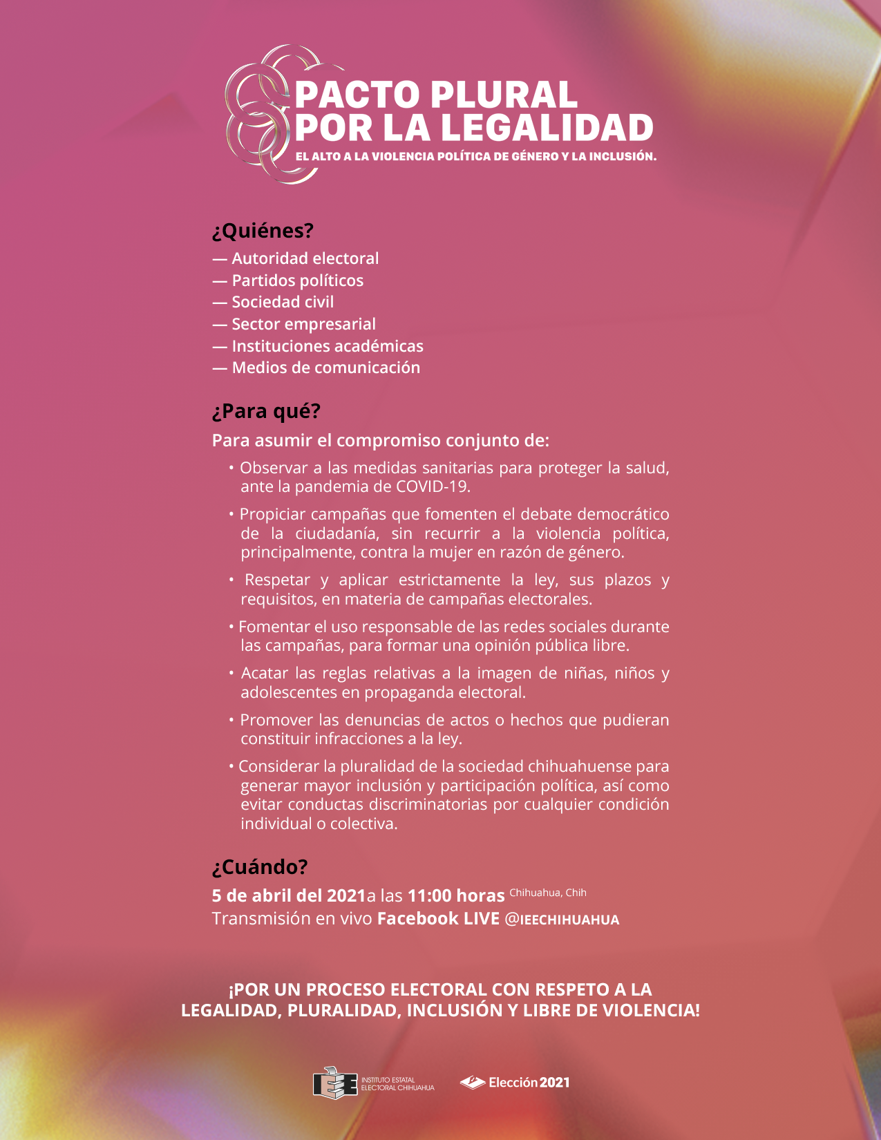 Chihuahua — Con la finalidad de propiciar mejores condiciones y unir voluntades para el fortalecimiento de la democracia en este proceso electoral 2020-2021, el Instituto Estatal Electoral de Chihuahua (IEE) invita a sumarse al Pacto plural por la legalidad, el alto a la violencia política de género y la inclusión, por el cual se asumirán compromisos compartidos entre la autoridad electoral, partidos políticos, sociedad civil, sector empresarial, instituciones académicas y medios de comunicación.
